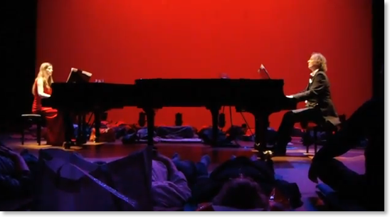 Canto Ostinato is een wonderschoon modern klassiek werk van Simeon ten Holt, gemaakt in (mijn geboortejaar) 1976. Een goede vriend liet het me een jaar of twaalf geleden horen. Ik was meteen hooked. Het is een stuk gemaakt voor twee tot vier piano’s en het is een soort trip van negentig minuten, met variaties op een steeds terugkerend thema. Er wordt wel gezegd dat je het ervaart als een treinreis waarin je meerdere landschappen doorkruist. Ik was 12 januari in het nieuwe DeLaMar Theater bij de uitvoering van Jeroen en Sandra van Veen, ja, man en vrouw. Een gedeelte van het publiek mocht op het toneel liggen om zo dicht mogelijk bij de vleugels te zijn en dus zo intens mogelijk de muziek te beleven. En daar lag ik, op mijn veel te weinig gebruikte yogamat tussen andere kampeerders. Sommigen hadden hele dekbedden meegenomen. Het was druk, we lagen hoofd aan hoofd. Meneer en mevrouw Van Veen kwamen in vol ornaat op en gingen achter de vleugels zitten. Het werd donker. Ik nestelde me liet mijn hoofd met een diepe, onhoorbare zucht op mijn kussentje vallen. De trein vertrok. De reis begon als een soort meditatie, ik was helemaal gefocust op de muziek en op mijn eigen ademhaling. Na een paar minuten opende ik mijn ogen en keek om me heen. Het was zo’n zoet beeld, al die volwassenen die stil en met een glimlach om de mond en nog net niet met hun duim erin, toch op avontuur waren. Ik sloot mijn ogen weer en vervolgde mijn reis. Negentig minuten later stapte ik uit de trein. Strontgelukkig.